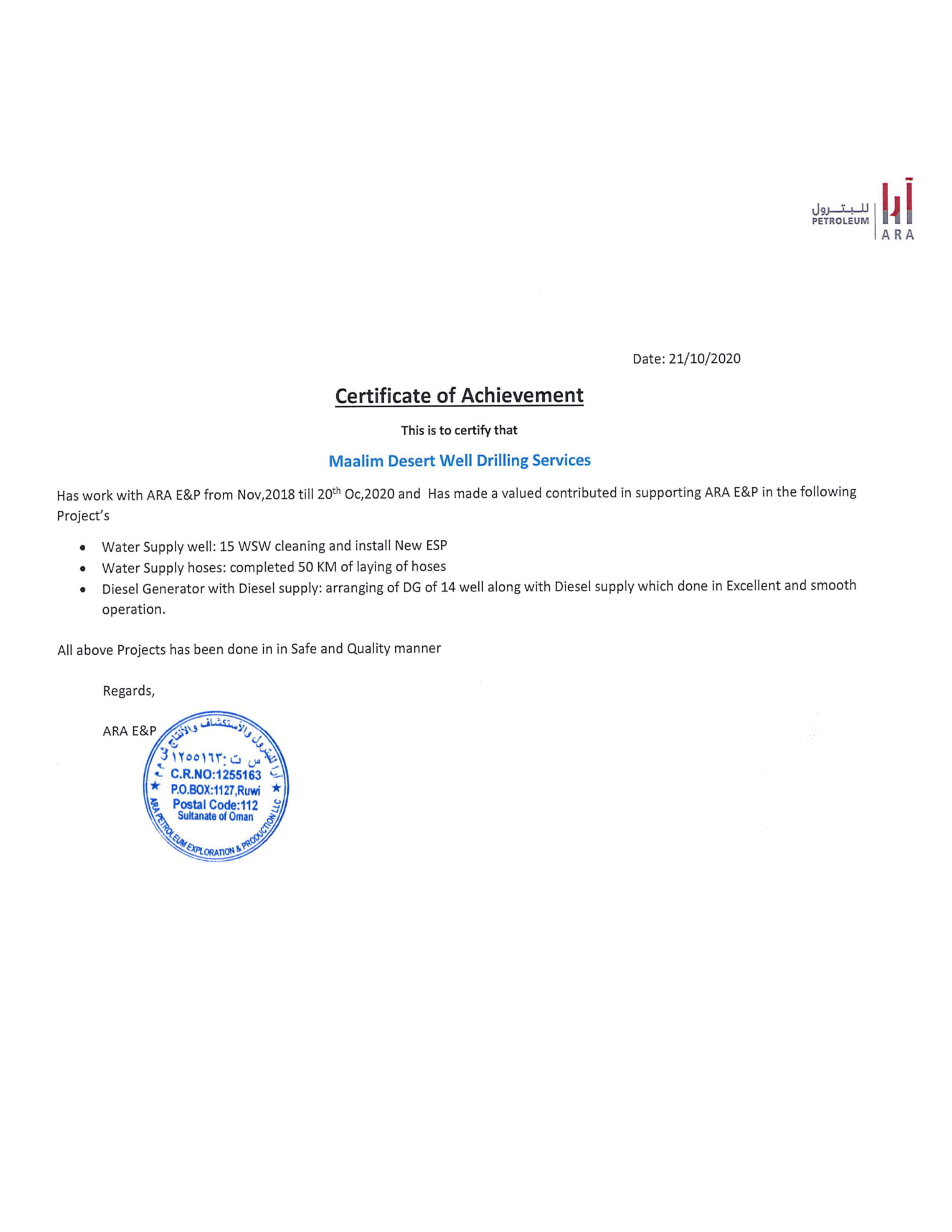design and drilling, inspection, cleaning, and rehabilitation of water wells. Installation & testing of water electro submersible pumps (ESP), Tubing replacement, well head maintenance, line maintenance and field complete water services. Supply of water hose line with accessories, ESP, tubing, well head with associated equipment, Supply and rental of de-watering pumps, diesel generators and diesel tanks.